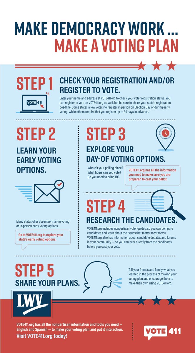 The right to vote is how we determine the future of our families, communities, & country. We are stronger as a nation when more people participate in our democracy. Do you have a plan to vote and make your voice heard? Visit http://VOTE411.org now to get