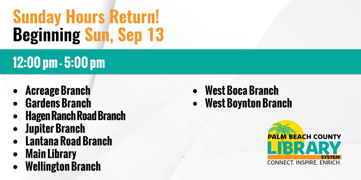 Beginning Sun, Sep 13, we will offer Sunday hours at select branches. For more information, visit http://www.pbclibrary.org .