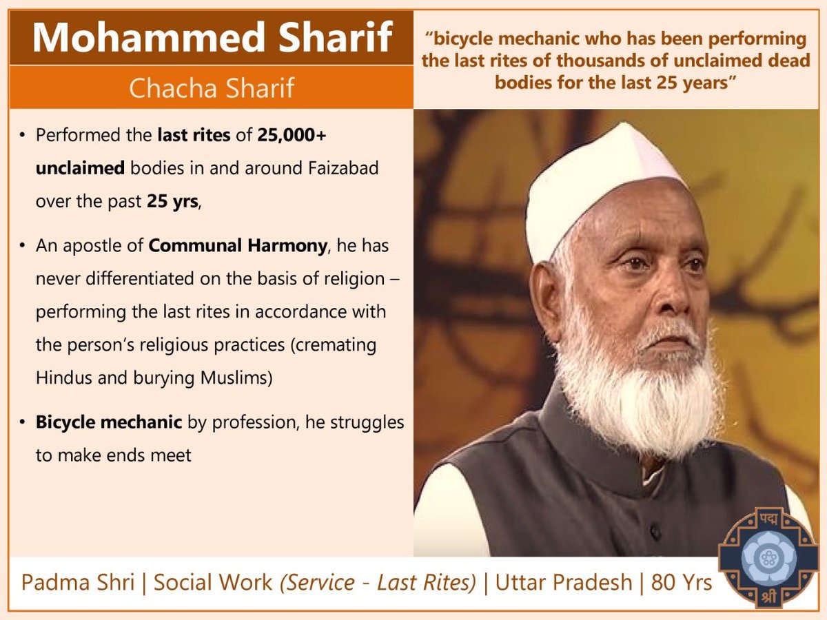 Mohammed Sharif, known as Chacha Sharif has been doing an incredible Seva. He is a bicycle mechanic by profession but has been performing the last rites of more than 25000 unclaimed dead bodies in the last 25 years . He has won a Padma Shri. So richly deserved