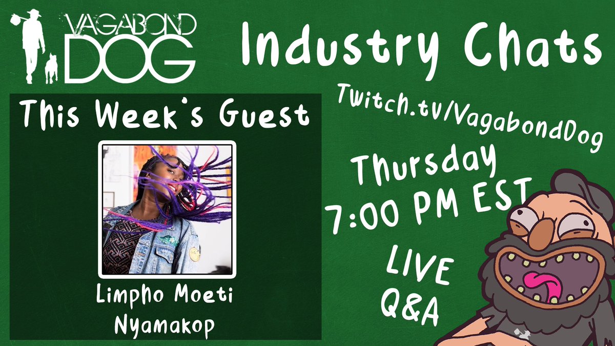 @justlimpho for this week's Industry Chats where we'll be talking about game production and bizdev magic (which she does for@nyamakop)! See you there, gang! Stream starts at 7PM EST Chat is live now: http://twitch.tv/vagabonddog pic.twitter.com/STH8zch2uD