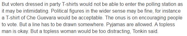 BBC guide to what you can wear while voting: fancy dress OK, pyjamas OK, topless men fine, topless women not allowed ("too distracting")pic.twitter.com/i0aZYicuyi