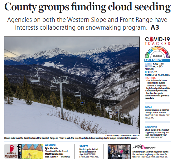Our cover for Sunday: County groups funding cloud seeding. Agencies on both the Western Slope and Front Range have interests collaborating on snowmaking program.pic.twitter.com/lwGC8bnUJH