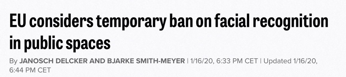 Paper #AI Regulation considers idea ban use#FacialRecognition in public spaces for 3-5years until safeguards exist.Says RD&Security (aft Court decision) exceptions will be needed& it will be preferable to focus at this stage full implementation#GDPR via@POLITICOEuropepic.twitter.com/Ub9KsvYb0k