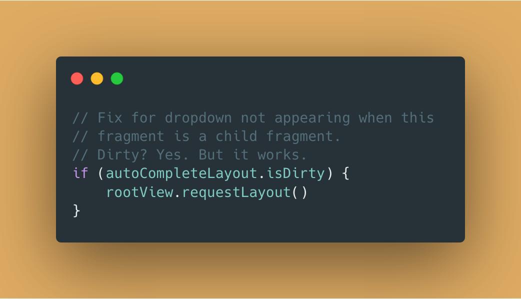 This has been the most annoying bug. After I put this screen (with the search bar) inside a child fragment, the autocomplete dropdown stopped showing when you type. But it *does* show when you leave the fragment and go back to it. WTF