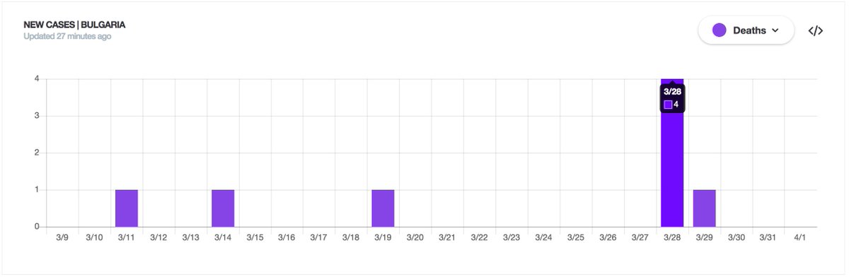And even if you don't trust the official reporting, or think that too many cases are underreported, number of deaths are a good proxy for more accurate info and in Bulgaria there aren't growing. The most in a single day was 4.pic.twitter.com/EeKu1L1gen