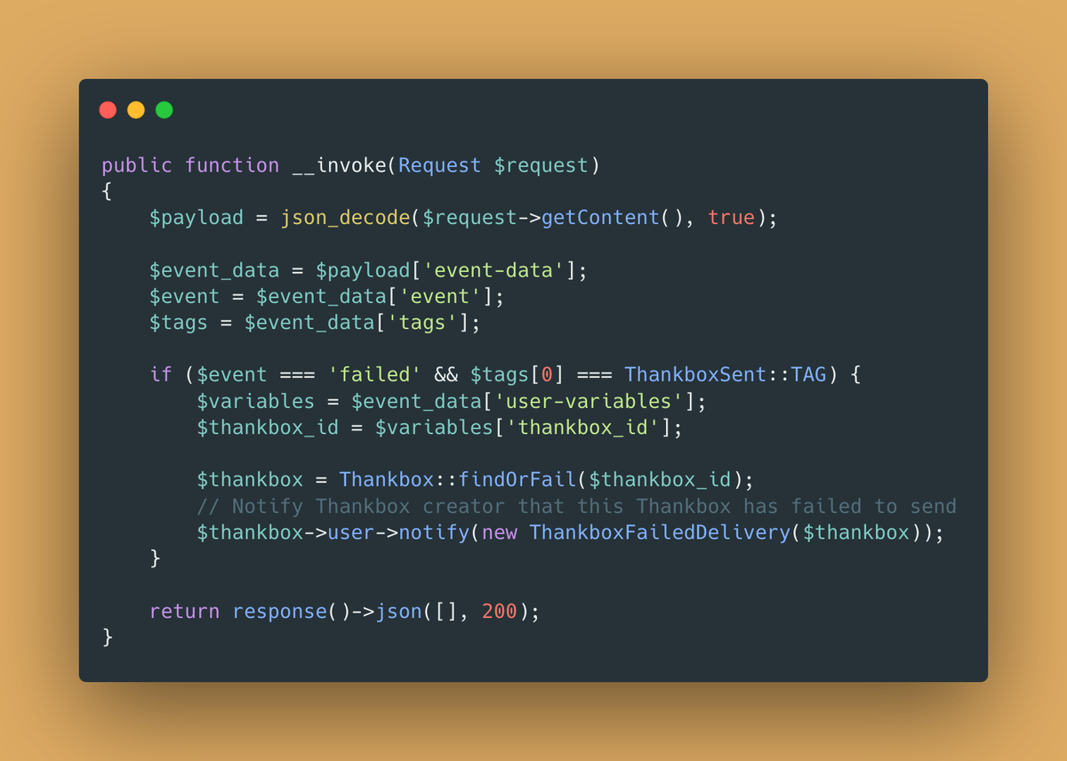 Yesterday I hooked up a Mailgun webhook to let me know when a @thankbox fails to deliver to a recipient. Then I can send a helpful email to the creator asking them to try again.pic.twitter.com/rQN6IZwGHV