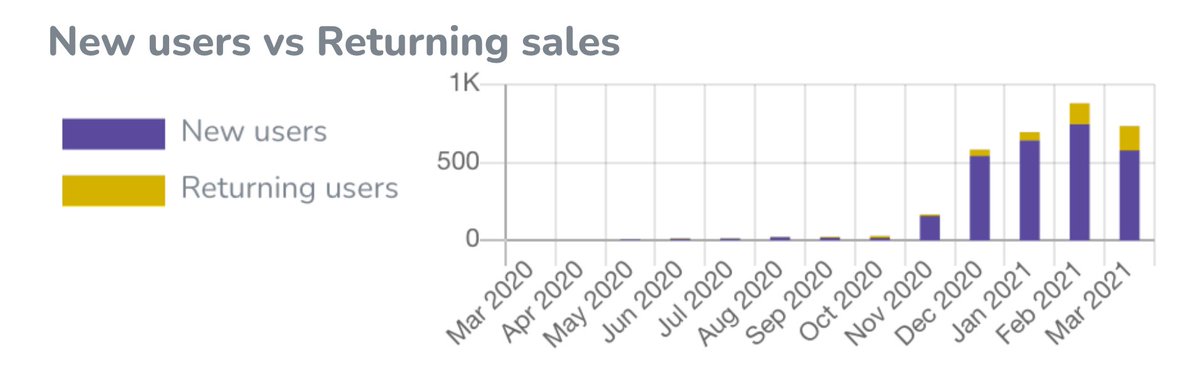 New metric I've started tracking - a breakdown of sales per month from new vs returning users. It's a good indicator of stickiness. Jan: 9% Feb: 15% March (so far): 21%pic.twitter.com/HfRIX0qFcn