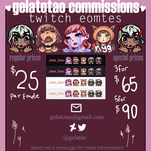 Hey! I currently have slots open for emotes!! If you are interested, send me a message :) forgive my typo of my username on my flyer! It should say @gelatotaopic.twitter.com/qRLGqqUdbW