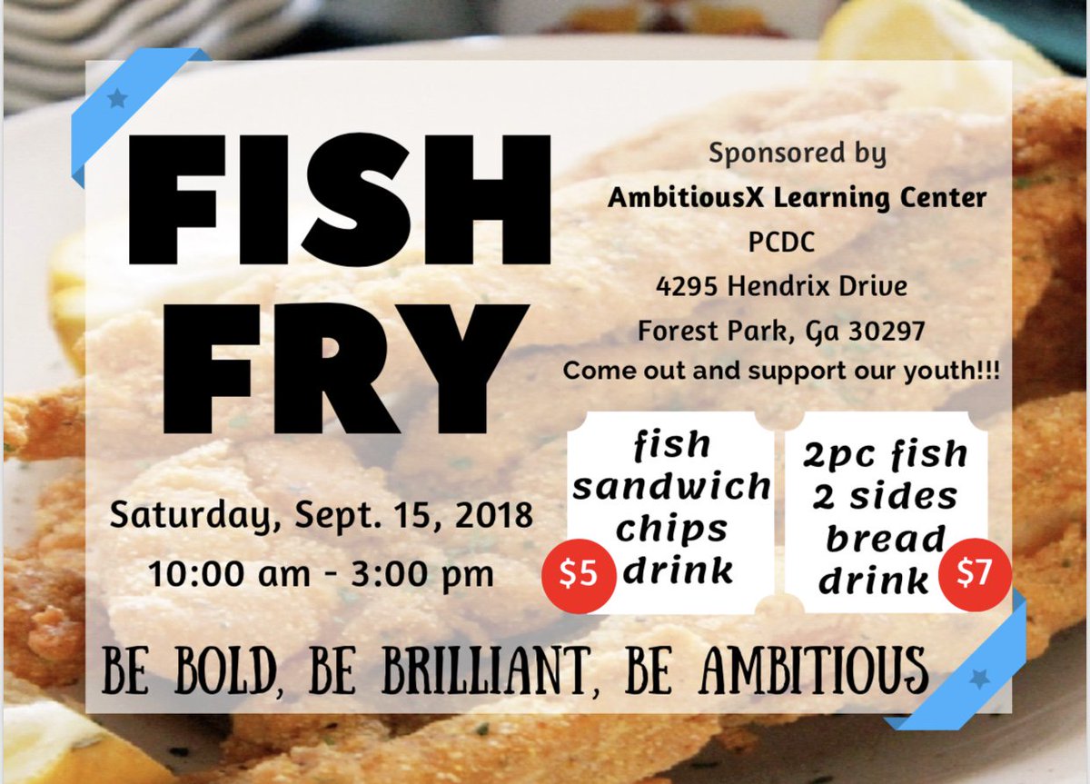 Come eat fish w/ #AmbitiousXLC tomorrow Sat Sept 15th Paradise CDC 4295 Hendrix Dr, Forest Park. 10am-3pm. I will be there w/ my hot sauce & tarter sauce. This is a fundraiser for the school program.pic.twitter.com/Kh2zEzgJFd