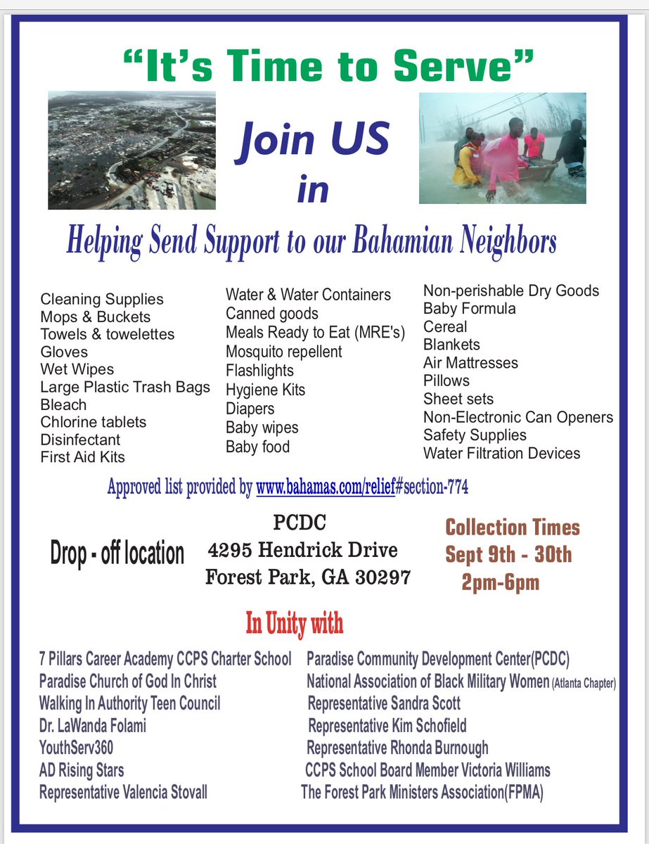 Now collecting items in #FPark to support Bahama families. The community has joined 2gether. Drop off now til Sept 30th from 2pm-6pm At Paradise Community Development Center (Gym) 4295 Hendrix Dr. 30297pic.twitter.com/PYjuxdFu8w