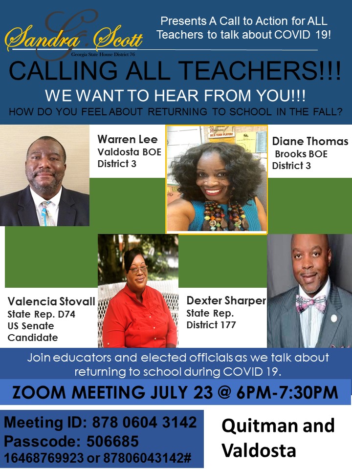 Wondering about returning to school & how teachers feel in South Ga? Rep. #SandraScott hosts Virtual Teacher Talk Townhall for #Valdosta #Quitman I will be a guest panelist. Thurs 7/23 6pm #StovallUSSenate #supportteacherspic.twitter.com/Gojd6vcWpr