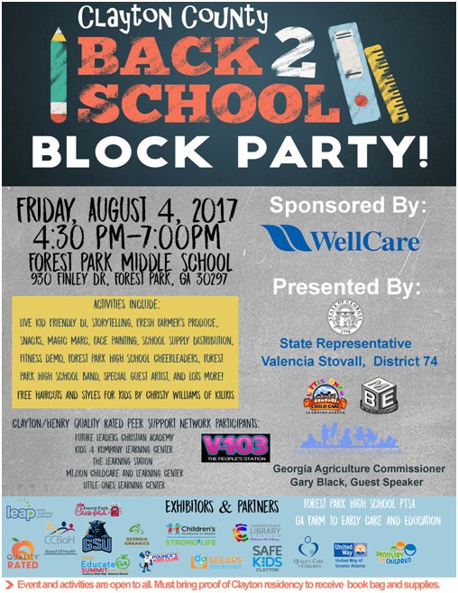 Mark Your Calendar Clayton Co Back 2 School Block Party Fri Aug 4th 4:30pm. Join my office, @LittleOnesFP #Welcarepic.twitter.com/SK9gbsYq3K