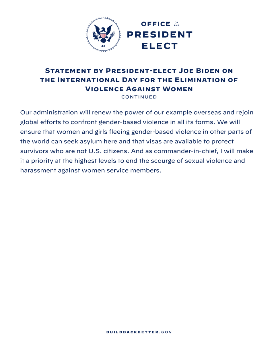 Statement by President-elect Joe Biden on the International Day for the Elimination of Violence Against Women.pic.twitter.com/Sm3w5ABqQ6