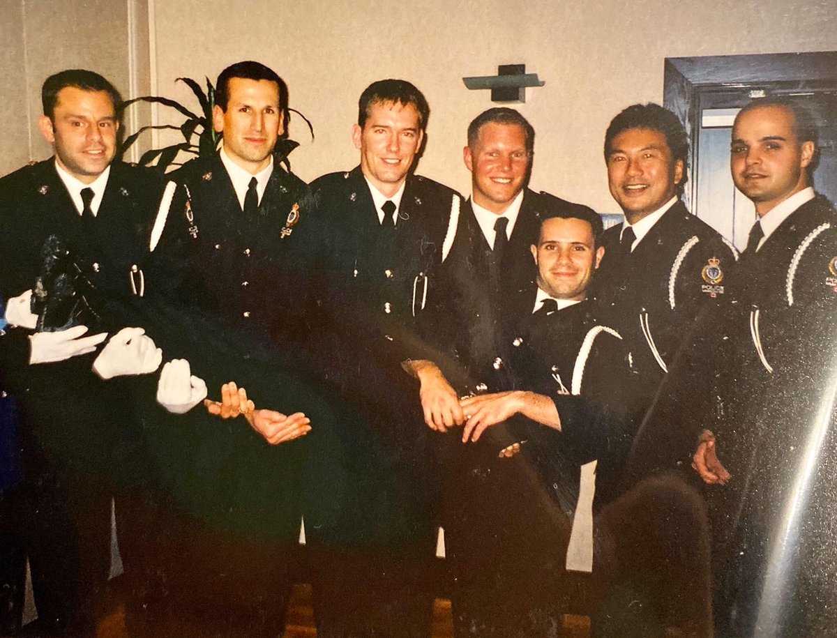 #VPD officers with 20 & 30 yrs of#ExemplaryService - proud members of Class 84 holding classmate Cst Ryan Masales @ 2001 grad - same officers today holding Ryan's son Ryder (Ryan taken too young by cancer in 2020#RIPbrother)@VancouverPDpic.twitter.com/q63EmqpY1s