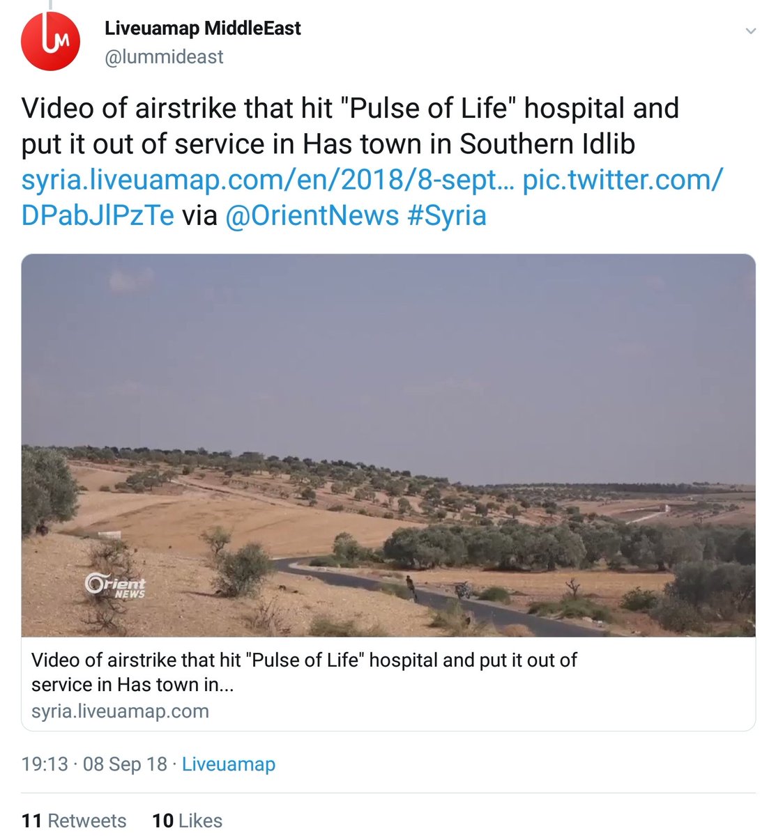 Claims fm terrorist media that the Pulse of Life Hospital has been destroyed in #Idlib by Russian bombing. Confused... the POL Hospital was "destroyed in September 2019 according to #WhiteHelmets Hadi Al Abdullah. Are we back in "last hospital" territory?https://www.youtube.com/watch?v=mkSq8gu_Tn8 …