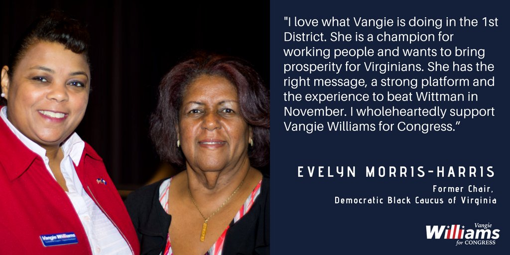I am happy to announce that we have the endorsement of Evelyn Morris-Harris, former chair of the Democratic Black Caucus of Virginia for 11 years. I am honored she has placed her faith in me to represent the 1st District. Read her full statement: http://bit.ly/2LWQYRu pic.twitter.com/lkXUEMTFAp