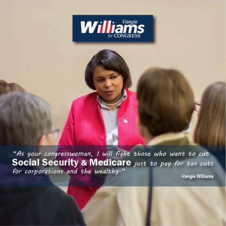 I promise to represent you, the people, and protect Social Security and Medicare from anyone who tries to make cuts to these programs. Before you go home tonight make sure to head to the polls and vote for me, Vangie Williams to be your candidate for Congress!pic.twitter.com/oFcuo6JRlk