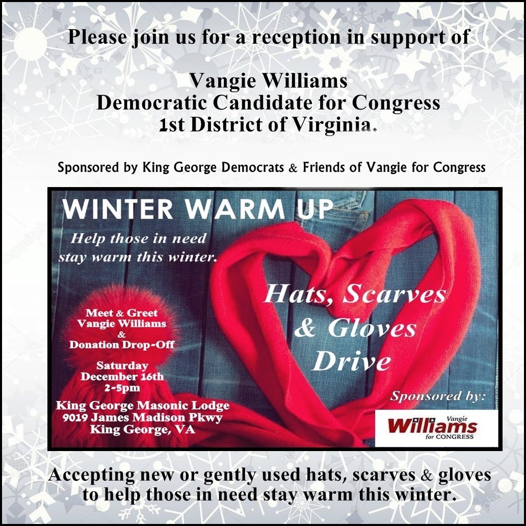 @TedSchubel Let's keep Virginia's homeless warm this winter! Drop off new or gently used hats, scarves & gloves at my Winter Warm-Up event on Saturday 12/16! I'll be there! Hope you are too! #VangieForCongress #VA01pic.twitter.com/ptykimpRzu