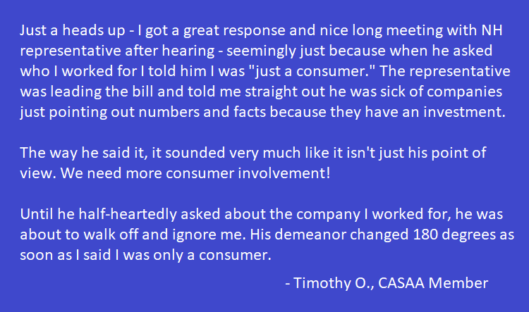 TAKING ACTION: A member's story emphasizing our frequent call for CONSUMERS to SHOW UP at hearings & MEET lawmakers. Many politicians distrust industry & don't believe that ADULT consumers want flavors, quit smoking, are healthier or even exist. Don't forget: YOU are CASAA, too!pic.twitter.com/zdapujb3Ha