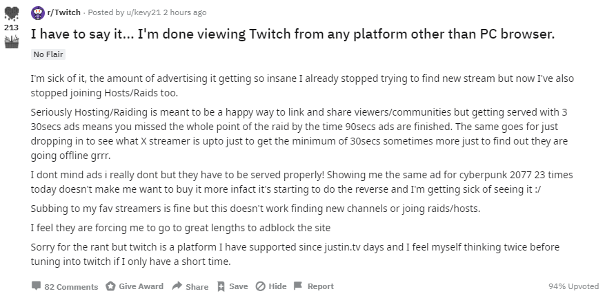 (for Mobile only, Desktop i use adblocks): On youtube i'd continue watching videos due to the 5second skip, on twitch i usually end up switching to youtube videos instead, dont wanna sit there and watch 1minute of ads