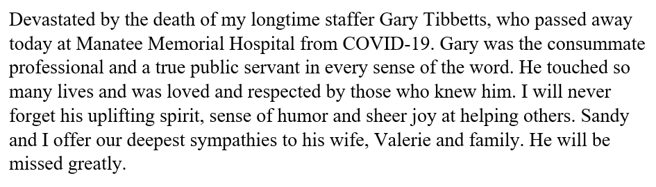 I’m so sorry for your loss. Gary Tibbetts was an authentic and compassionate human being. A national mask mandate is our best chance to prevent more needless deaths. I hope you will advocate for the lives of your constituents.
