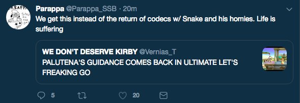 I swear people will always find something to complain about. Also just because Palutena's Guidance is coming back doesn't mean Snake's Codecs aren't coming back as well.pic.twitter.com/jNDQl2UJqs