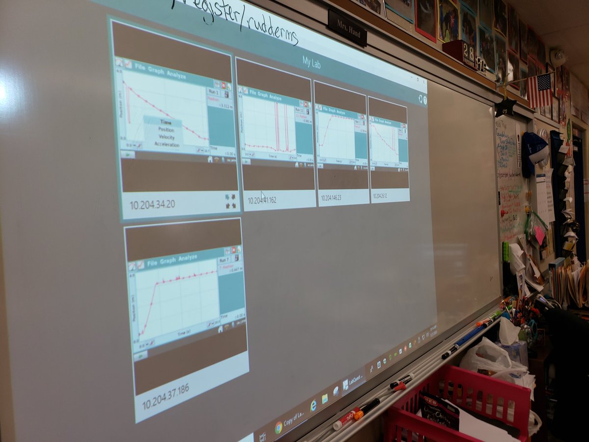 I was excited about this! First had ss predict how the graphs would compare for smart carts with bumper vs hoop force probe attachments on whiteboards, then verified experimentally using