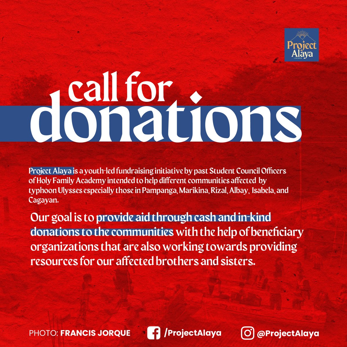 #ProjectAlaya CALLING FOR DONATIONS!#UlyssesPH has severely affected Filipinos, leaving cities and provinces submerged in floodwater. We are knocking on your hearts to help us in providing aid to our beneficiaries by spreading awareness and donating. See post for more details.pic.twitter.com/OXBI0JmYHJ