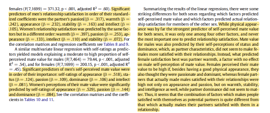 What women say is important for their own self-perceived mate value, in order of importance: 1. Appearance 2. Passion 3. Dominance What predicts men's satisfaction w/ their partner, in order of importance: 1. Passion 2. Warmth 3. Appearance 4. Stability 5. Intellectpic.twitter.com/EaMd8N2WdG
