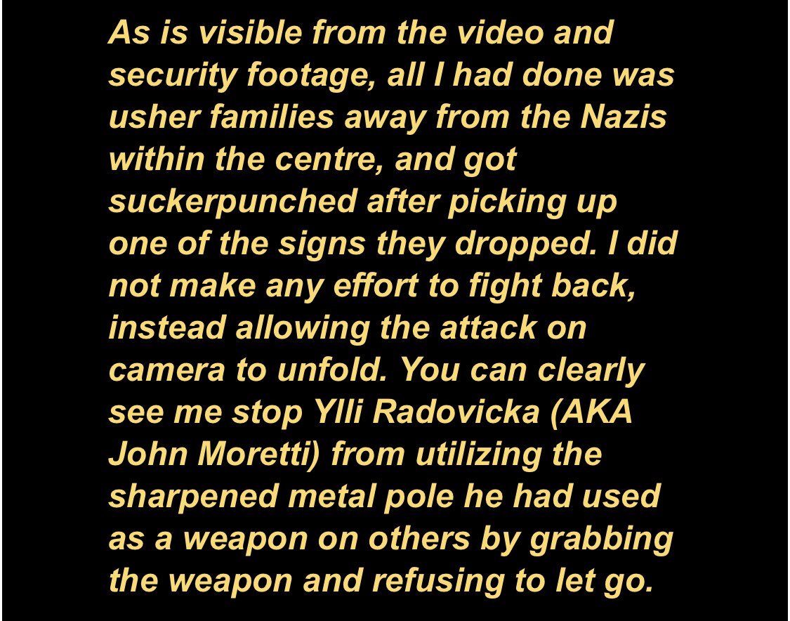 CW: violence Another angle of the mall fight yesterday in Toronto after Pegida. Vanderweide sucker punching someone, and the same person on the ground being kicked and hit by Radovicka, while Boswick screams “fuck him up” and “show us your face!”pic.twitter.com/F68cfSe7Z0
