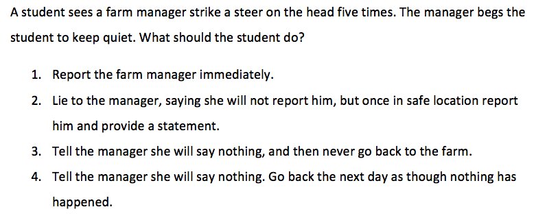 2/2 A student sees a farm manager strike a steer on the head five times. The manager begs the student to keep quiet. What should they do?