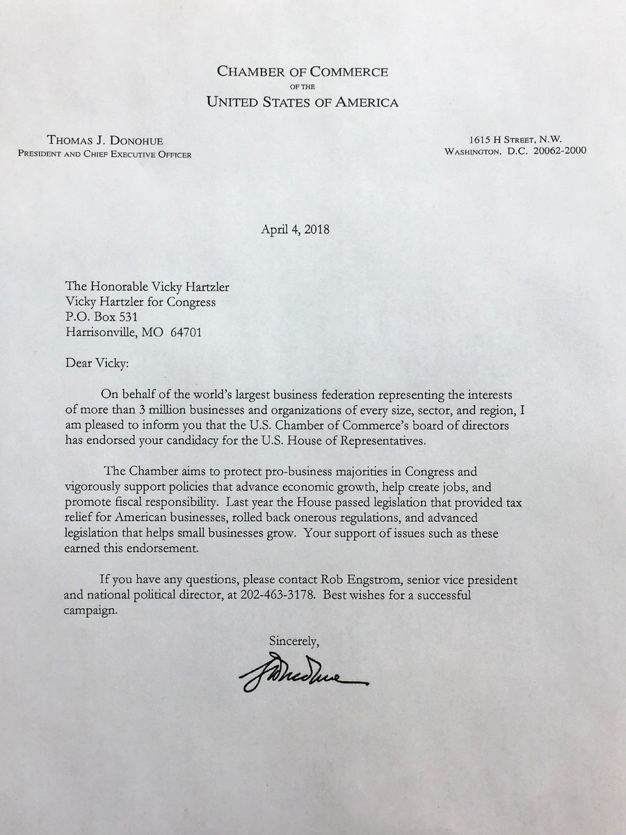I am humbled to have been endorsed by the United States Chamber of Commerce. The businesses of Missouri’s 4th district play an important role in the economies of our state and nation. Thank you to the U.S. Chamber of Commerce for your continued support.pic.twitter.com/RWSRrmqiZQ
