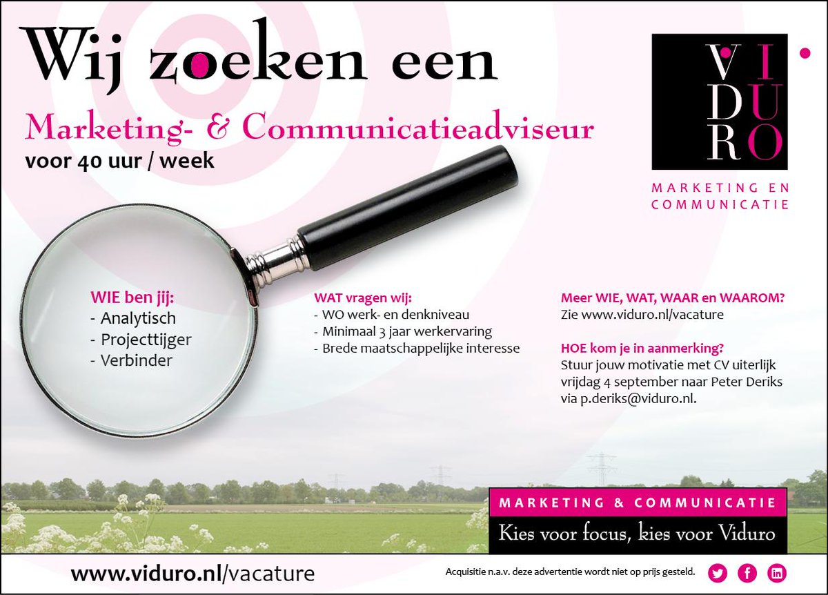 Wij zoeken een Marketing- & Communicatieadviseur. WIE, WAT, WAAR, WAAROM en HOE? http://www.viduro.nl/vacature pic.twitter.com/fMjEq169tZ