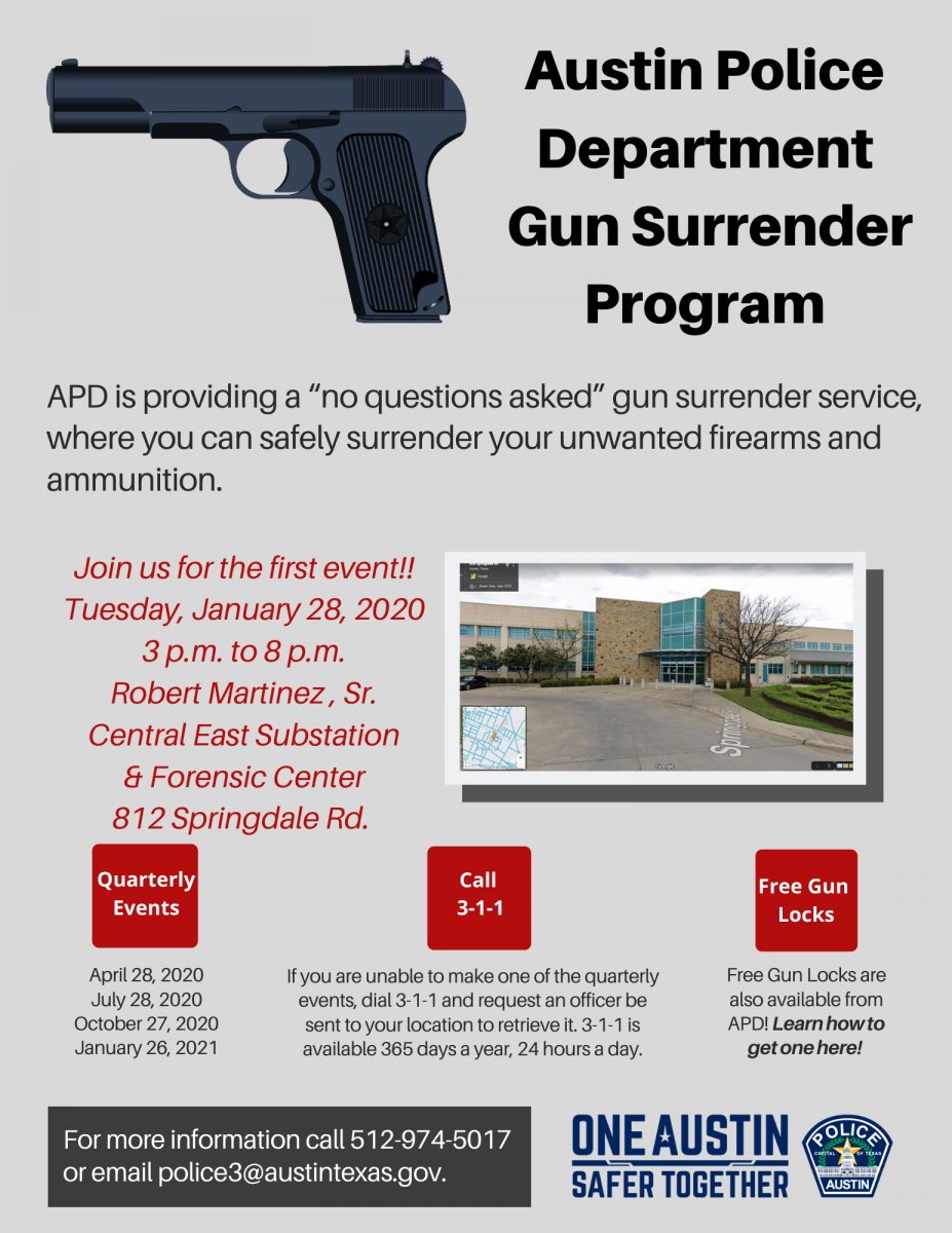 @Austin_Police "no questions asked" gun surrender event is today from 3 to 8 pm at the Robert Martinez Sr. Central East Substation & Forensic Center on 812 Springdale Rd. For more info. on the event and surrender guidelines, check out the flyers below.#txlegepic.twitter.com/zZG1DEFzcF