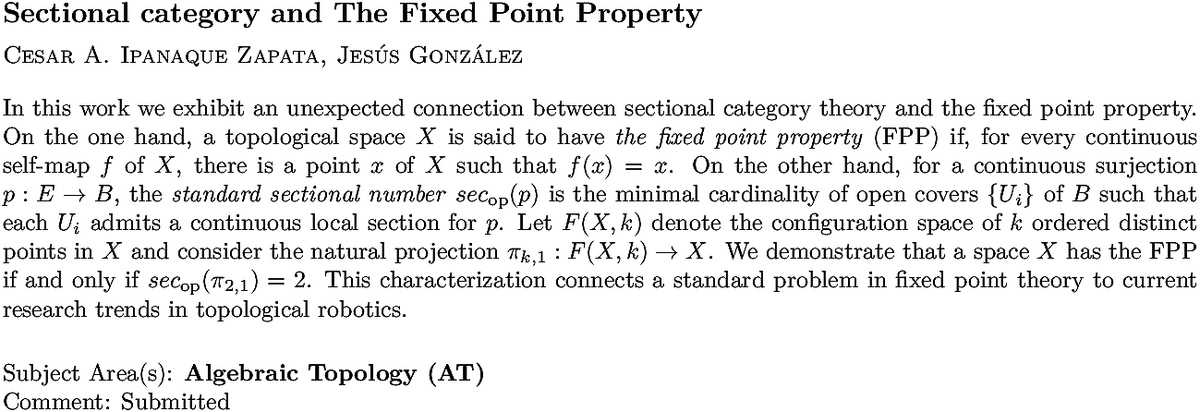 "This characterization connects a standard problem in fixed point theory to current research trends in topological robotics."https://twitter.com/arXiv_math_AT/status/1204554047358951429 …