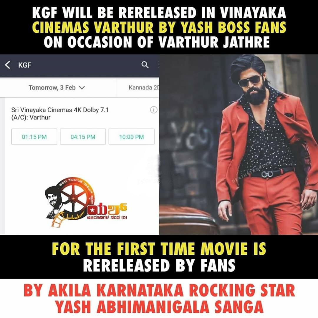 ವರ್ತೂರು ಚನ್ನರಾಯಸ್ವಾಮಿ ಬ್ರಹ್ಮರಥೋತ್ಸವ ಜಾತ್ರೆ ಹಾಗೂ ಕರಗದ ಪ್ರಯುಕ್ತ "ಅಖಿಲ ಕರ್ನಾಟಕ ರಾಕಿಂಗ್ ಸ್ಟಾರ್ ಯಶ್ ಅಭಿಮಾನಿ ಸಂಘ (ರಿ)" ಇವರಿಂದ ಅಭಿಮಾನಿಗಳ ಒತ್ತಾಯದ ಮೇರೆಗೆ ವಿನಾಯಕ ಥಿಯೇಟರ್ ನಲ್ಲಿ ಕೆಜಿಎಫ್ ಚಾಪ್ಟರ್ 1 ಚಿತ್ರವು ನಾಳೆಯಿಂದ ಮರು ಬಿಡುಗಡೆಯಾಗಲಿದೆ..!