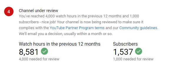 i am not applied yet my channel crossed 4000 hours watch time and 1000 subscribe therefore i am asking i am getting the below screen since last 20 days please help me on thispic.twitter.com/FWCrugoDYy
