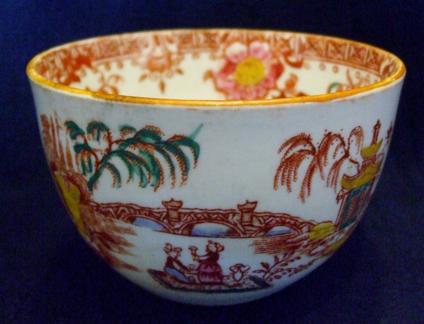 GEORGIAN CLOBBERED CHINOISERIE RED TRANSFER CHINA BOWL & SAUCER c1820-30's. OFFERS INVITED