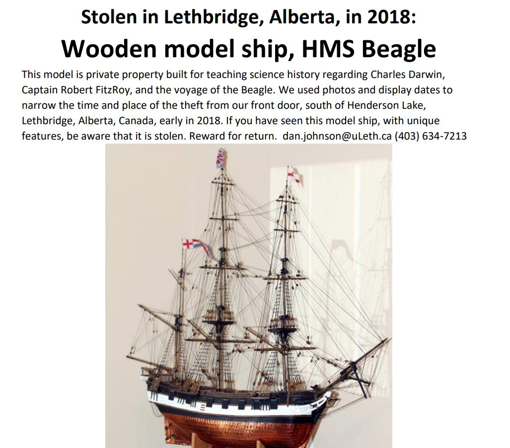 Stolen in Lethbridge, Alberta, Canada, 2018. Wooden model ship, HMS Beagle. Private property, home-made for teaching science history regarding Charles Darwin, Captain Robert FitzRoy, and the voyage of the Beagle. dan.johnson@uLeth.ca (403) 634-7213