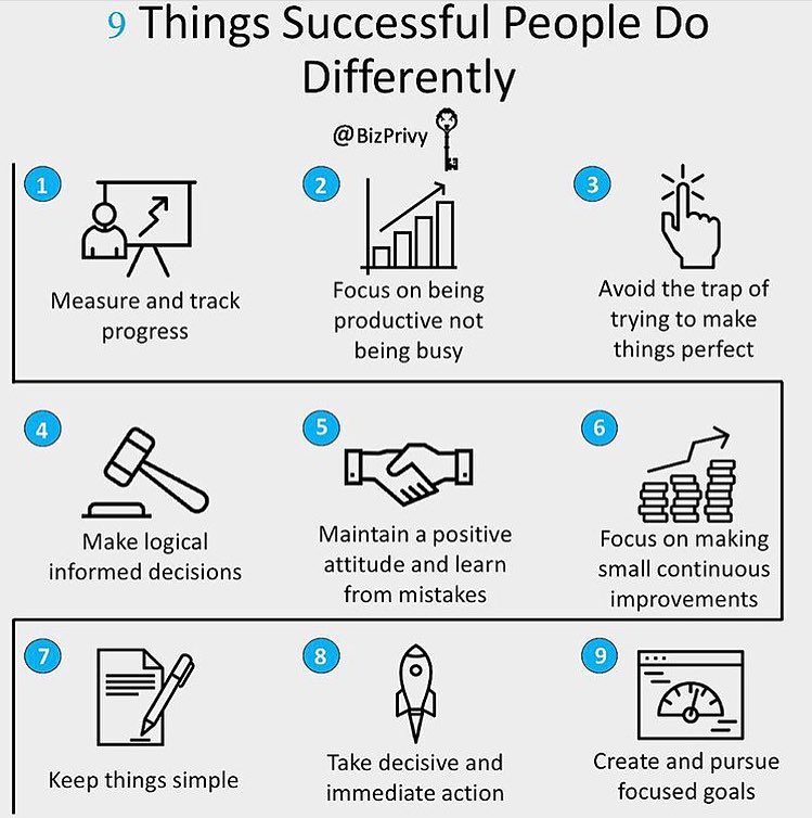 9 things successful people do differently: Measure & track progress Focus on being productive Make logical informed decisions Maintain a positive attitude Focus making small continuous improvements Keep things simple Take immediate action Create & pursue focused goalspic.twitter.com/PbwaVEezp1