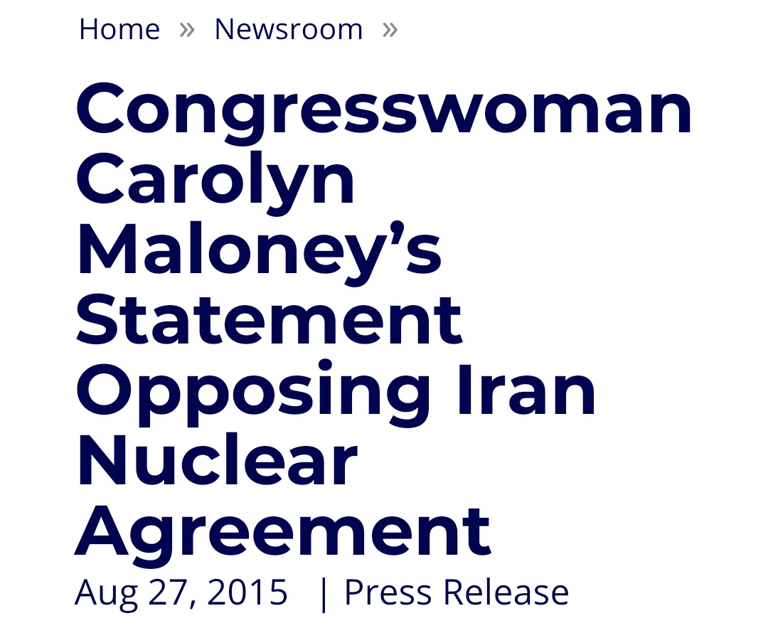 Oh... I see, but were you okay when she opposed Obama's Iran Deal? https://maloney.house.gov/media-center/press-releases/congresswoman-carolyn-maloney-s-statement-opposing-iran-nuclear … Or what about how her campaign is financed (~3% are from small donations