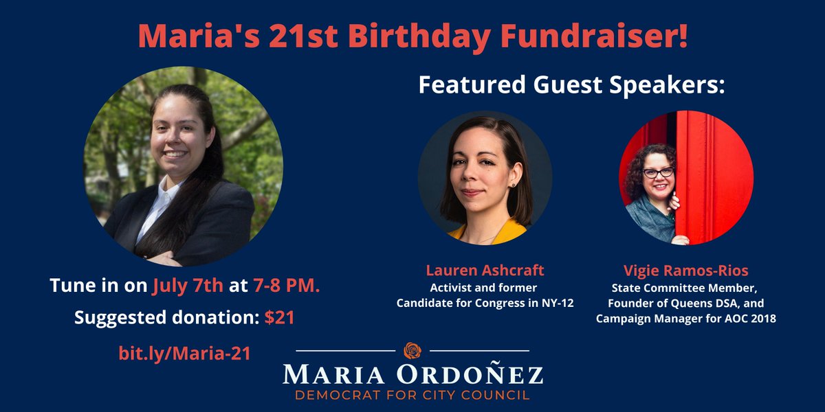 Join us this Tuesday, July 7th @ 7pm to celebrate my 21st bday with amazing guest speakers @VoteAshcraft & @vgsalsa! We’ll get together on zoom to celebrate, talk about current issues, & talk about my City Council campaign! Get tickets here: http://bit.ly/Maria-21 pic.twitter.com/IWDtve1Ue8