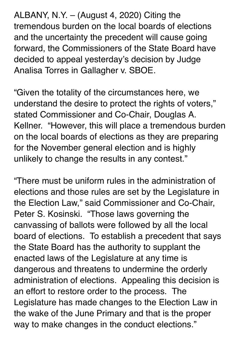 .@NYSBOE is appealing decision to count ballots w/o postmarks, a case brought by @em4assembly @surajpatelnyc. Cites “tremendous burden on the local boards ... preparing for the November general election and is highly unlikely to change the results in any contest”pic.twitter.com/OIbzu0WY7s