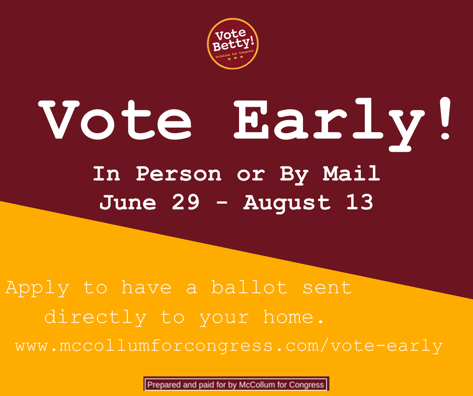 Early voting has begun! Get your ballot at http://www.mccollumforcongress.com/vote-early pic.twitter.com/1YenW5NKAf