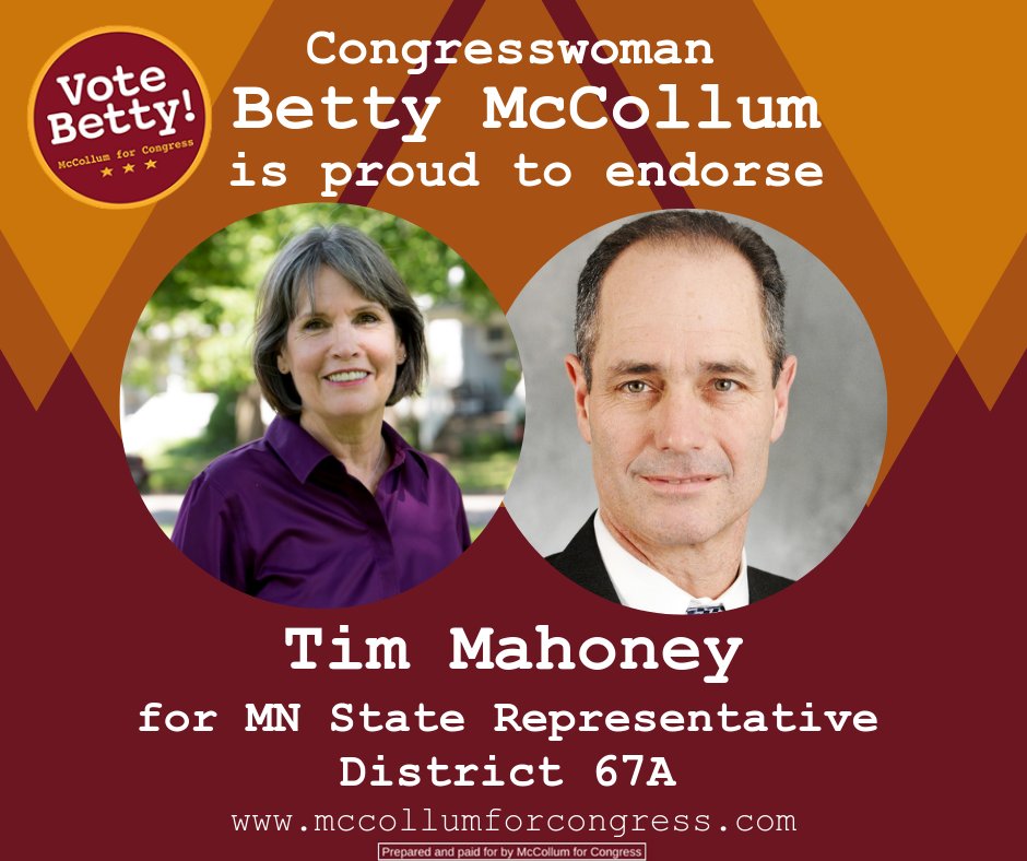 Congresswoman Betty McCollum proudly endorses @TimMahoney67A for MN State Representative in District 67A! #mnleg #dflpic.twitter.com/kseY7GIodk