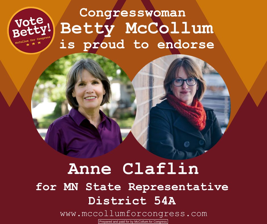 Congresswoman Betty McCollum proudly endorses @anne_claflin for State Representative for MN State Representative in District 54A!pic.twitter.com/lOb6UasGpQ