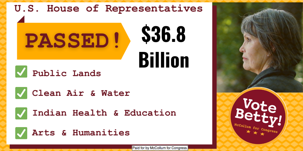 Today, the U.S. House passed Betty's vision/priorities for the Interior-Environment funding bill! That's $36.8 BILLION for public lands, clean air & water, Indian Health Services & education, Arts & Humanities, the removal of confederate symbols from national parks & much more.pic.twitter.com/qVkITqge19