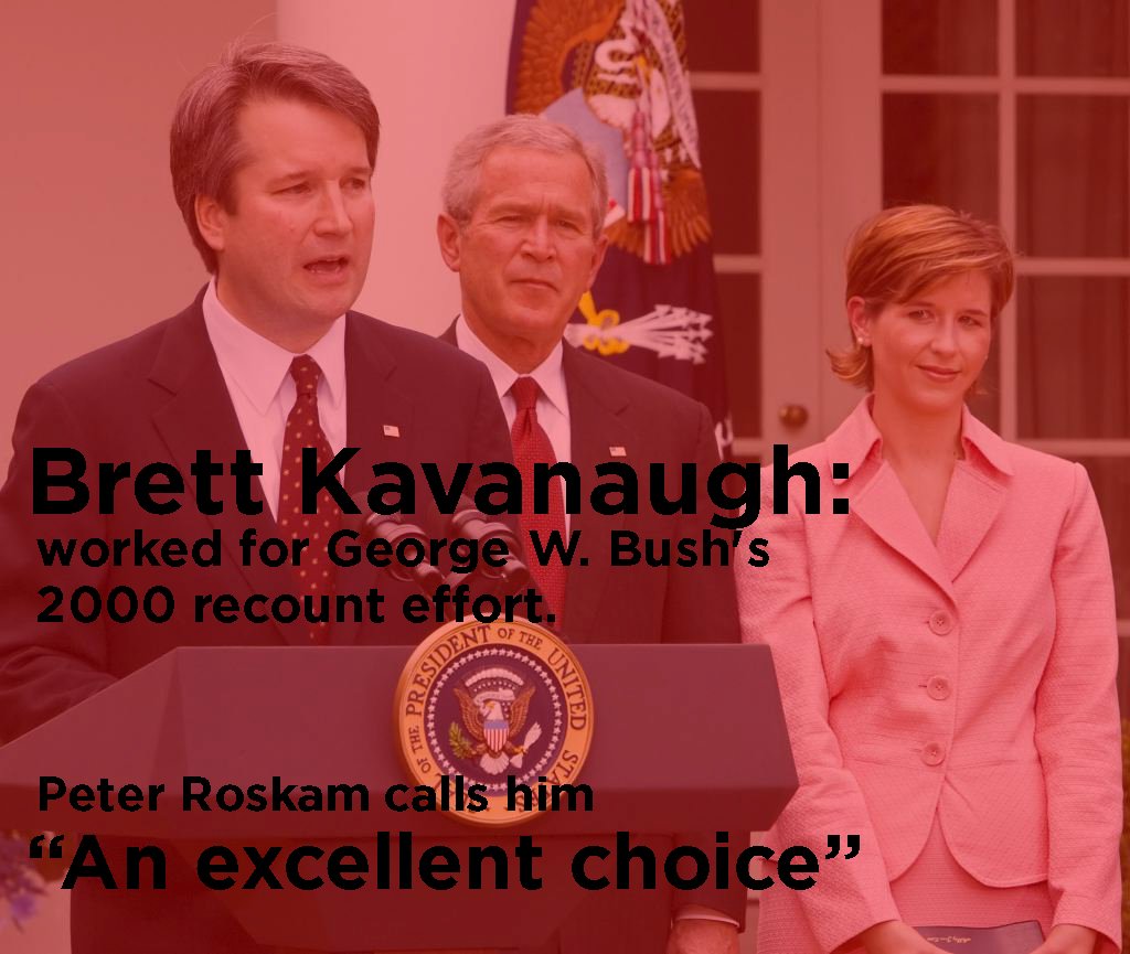 Brett Kavanaugh started as a political operative, working for George W. Bush's 2000 recount effort. When he turned to the law, he struck down legislation that strengthened a woman's right to choose. Now, @PeterRoskam calls him "an excellent choice". http://bit.ly/2ugfype pic.twitter.com/z0Wx817364