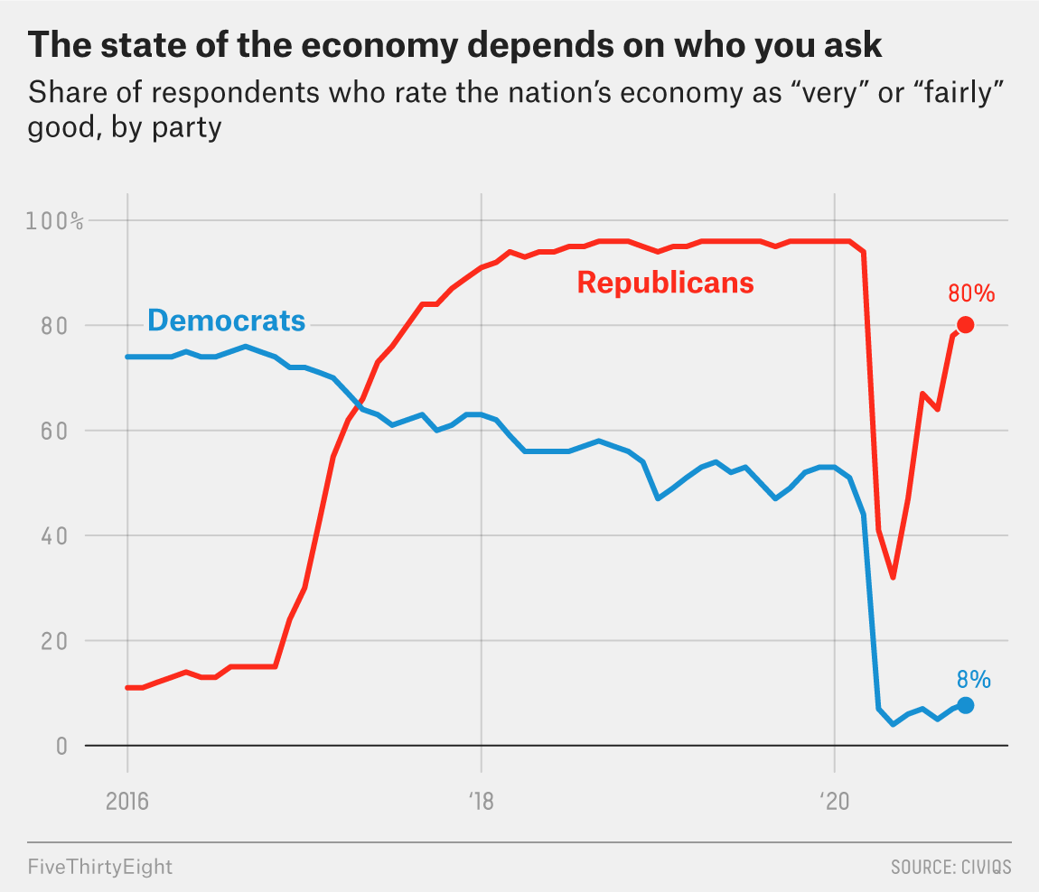 A poll conducted at the end of September found that 80% of Republicans thought the economy was in at least fairly good shape, compared to only 8% of Democrats. https://53eig.ht/3js18tL pic.twitter.com/DmluHmIRaI