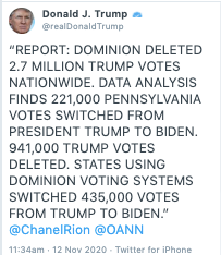 Sweet Jesus. The only thing worse than Trump live-tweeting Fox to try to destroy faith in elections is him livetweeting OAN to do it. Left, OAN, 11:06 a.m. Right, Trump, 11:34 a.m.pic.twitter.com/5nJ19DVXCS